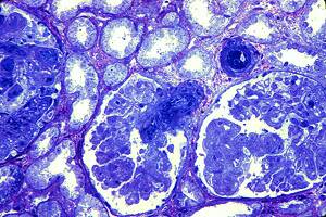 Fig# 15. GNPP III. CA2, CC3 (OMS VI?): GNPP III con semilunas epiteliales < 50%, semilunas fibrosas >50% . Fibrosis >50%. |