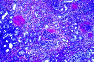 Fig# 13. GNPP III. CA3, CC1 (OMS IVB,C?): GNPP con GNMP, y trombos hyalinos y fibrosis temprana. MOAR 400X. |
