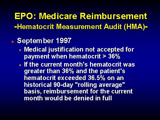 This PM is to clarify and state explicitly that you are not to review claims exceeding an average hematocrit of 36.5%. Instead, these claims should be automatically denied as not reasonable and necessary. Based on considerable research of the literature and discussions with a noted hematologist at the National Institutes of Health, HCFA is not able to confirm the allegations that there is a medical justification for maintaining sustained hematocrit levels above 36%.