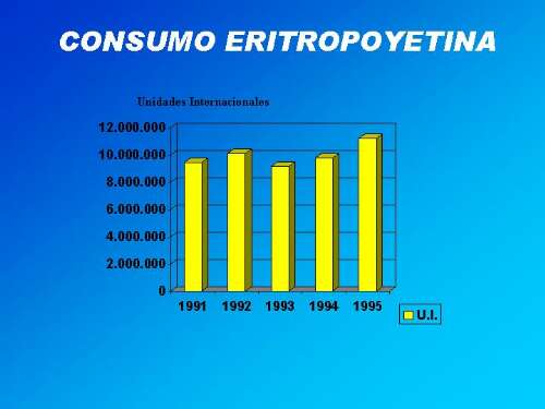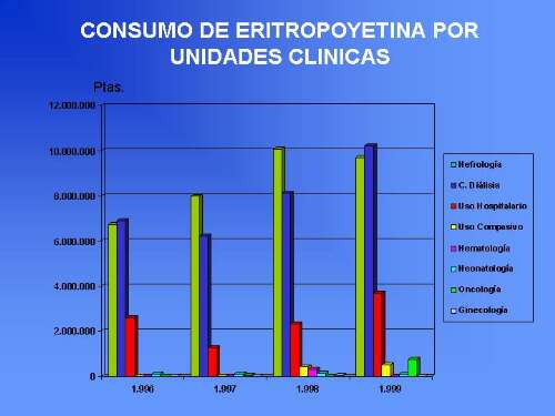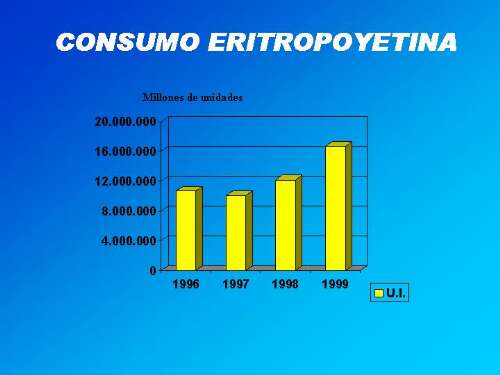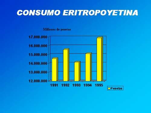 En el período comprendido entre 1996 a 1999, el consumo medio pasó de 10 millones de Unidades de Eritropoyetina en 1996 a 15 millones de media en 1997 y 1998, y en el último año el consumo aumentó hasta casi 17 millones de Unidades con un gasto asociado de 25 millones de pesetas.
