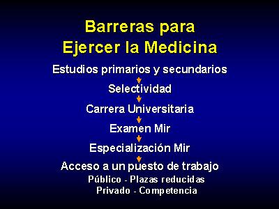 Una persona que desee ejercer la medicina debe superar los estudios primarios y secundarios y selectividad con buenas notas, aprobar la carrera universitaria, el examen MIR, pasar la especialización MIR, y acceder a un puesto de trabajo público o privado.
