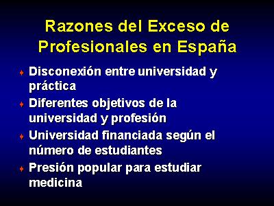 Existen diversas razones que explican el exceso de profesionales sanitarios en España. El principal es la disconexión entre universidad y práctica que se manifiesta en la existencia de diferentes objetivos en la universidad y profesión. Así la universidad es universidad financiada según el número de estudiantes, lo que hace que se incremente el número de estudiantes por encima de las necesidades existentes. Además, existe una presión popular para estudiar medicina que no ha sido contrarrestada políticamente.