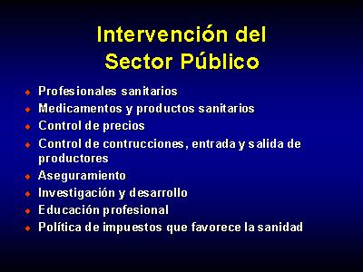 La intervención del sector público es muy amplia, y afecta a casi todos los aspectos de la asistencia sanitaria: