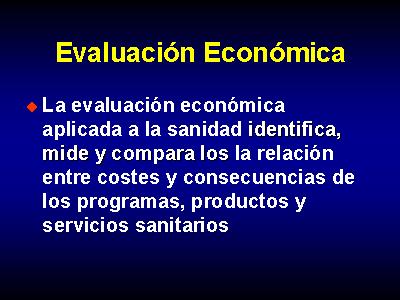La evaluación económica aplicada a la sanidad identifica, mide y compara los la relación entre costes y consecuencias de los programas, productos y servicios sanitarios