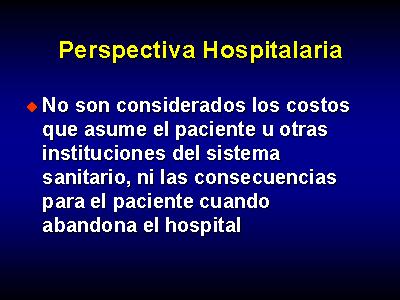 Asi, desde una perspectiva hospitalaria, no son considerados los costos que asume el paciente u otras instituciones del sistema sanitario, ni las consecuencias para el paciente cuando abandona el hospital.