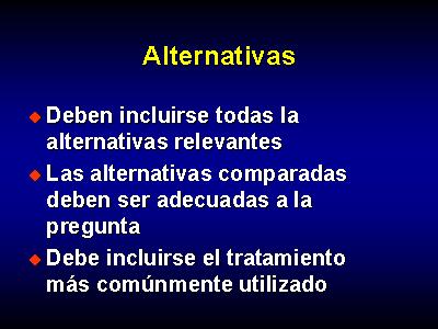 La elección de las alternativas que se estudiarán es esencial. Deben incluirse todas la alternativas relevantes. Y las alternativas comparadas deben ser adecuadas a la pregunta. Tambien debe incluirse el tratamiento más comúnmente utilizado en la práctica.