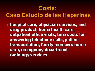 El estudio de las heparinas incluye una larga lista de costes, entre los que se encuentran: hospital care, physician services, drug product, home health care, outpatient office visits, time costs for answering telephone calls, patient transportation, family members home care, emergency department, and radiology services