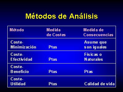 En esta tabla vemos cuales son el tipo de medida que utiliza cada uno de estos cuatro métodos. Todos ellos miden los costes en pesetas. La diferencia entre ellos deriva de la forma en que se miden las consecuencias.