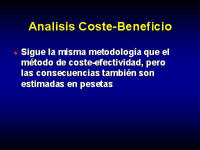 El análisis coste-beneficio sigue la misma metodología que el método de coste-efectividad, pero las consecuencias también son estimadas en pesetas.