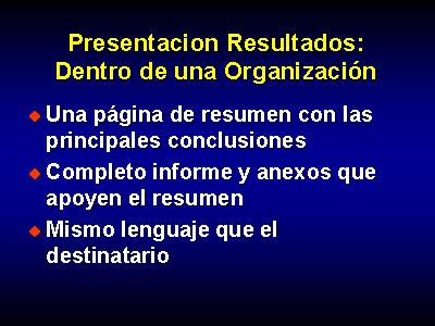 Es aconsejable que se realice una página de resumen con las principales conclusiones, seguida por un informe completo y anexos que apoyen el resumen. Es esencial que el estudio tenga el mismo lenguaje que el que utiliza el destinatario.