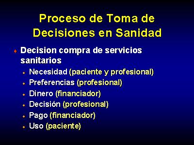 En el caso de la sanidad, la decisión se complica. El profesional sanitario aparece como decisor acerca de cuales son las necesidades, preferencias y decide en muchos casos. El financiador es quien toma la decision relativa a cuanto dinero puede disponerse y como se realiza el pago. Por último, es el paciente el que usa la sanidad.