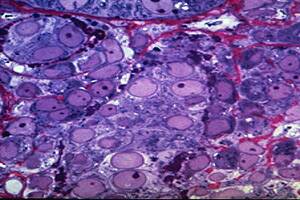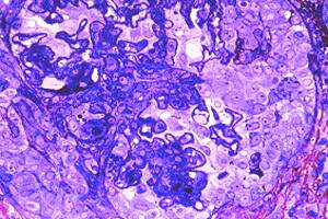 Fig# 13. GNPP III. CA3, CC1 (OMS IVB,C?): GNPP con GNMP, y trombos hyalinos y fibrosis temprana. MOAR 400X. |