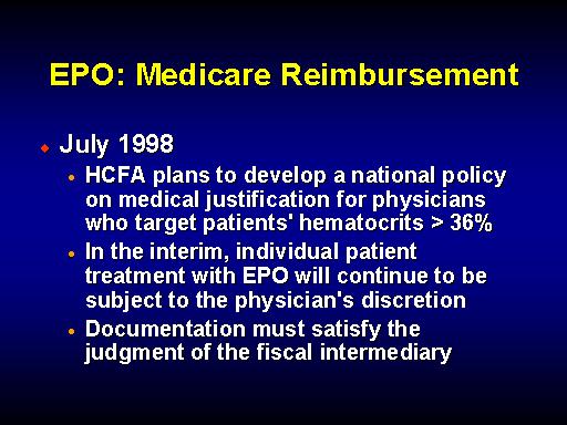 PROGRAM MEMORANDUM. INTERMEDIARIES/CARRIERS. Department of Health and Human Services. Health Care Financing Administration . Transmittal No. AB-98- 34 Date JULY 1998. Change Request #555. SUBJECT:Modification of Medicare Policy for Erythropoietin (EPO) http://www.hcfa.gov/pubforms/transmit/r5ch34p2.htm