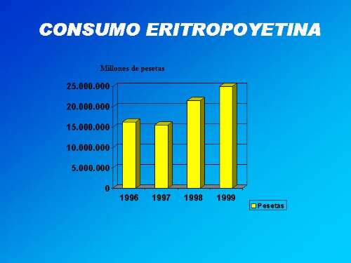 En el período comprendido entre 1996 a 1999, el consumo medio pasó de 10 millones de Unidades de Eritropoyetina en 1996 a 15 millones de media en 1997 y 1998, y en el último año el consumo aumentó hasta casi 17 millones de Unidades con un gasto asociado de 25 millones de pesetas.