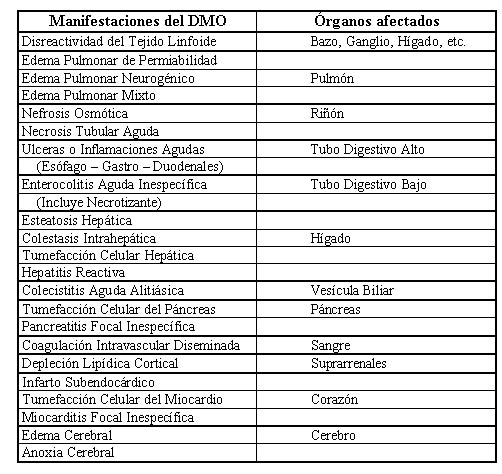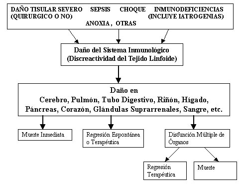1) Cuando un factor causal desata en el organismo una respuesta inme-diata, fundamentalmente inmunológica que se hace sistémica y da lugar a productos tóxicos que ocasionan principalmente lesiones endoteliales y anóxicas en diversos órganos, estamos en presencia de un DMO.