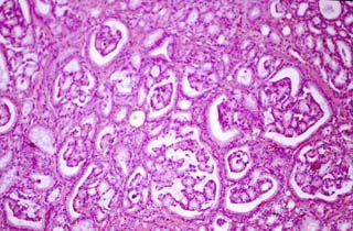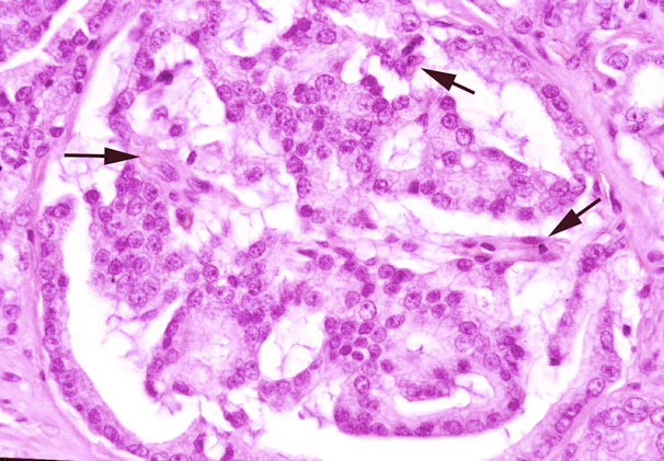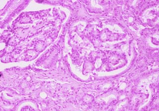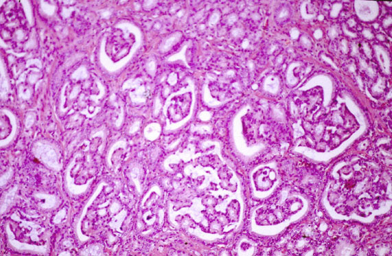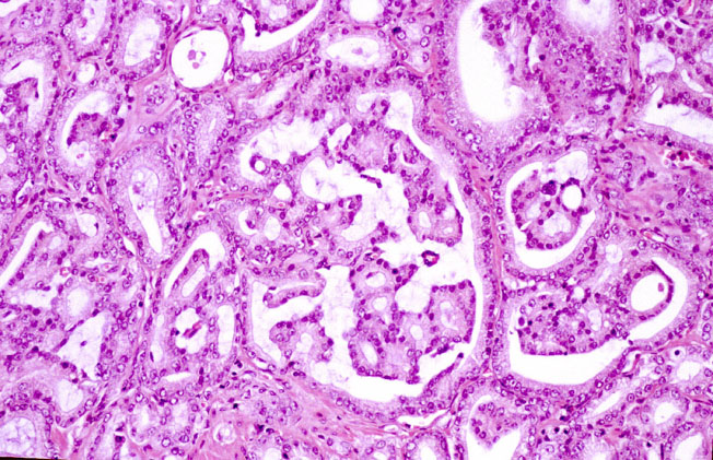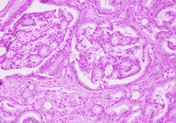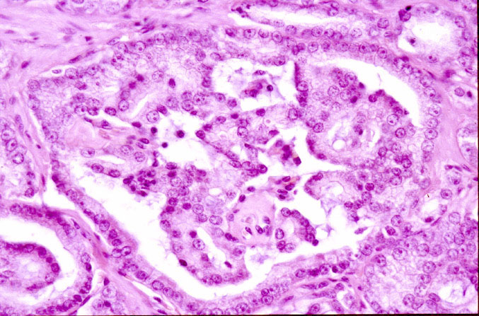 Aunque la primera mención sobre ciertas estructuras glomeruloides en el adenocarcinoma de prostata la hace Epstein en 1995 (1), no es hasta 1998 cuando aparece el primer artículo sobre este detalle histológico (2). Según estos autores, se trata de un hallazgo extraordinariamente infrecuente y exclusivo del carcinoma (solo el 4,5% de las prostatectomías radicales lo presentan). Al parecer, solo se observa en el apex ó en zonas muy periféricas de la próstata, y debe ser distinguido del patrón cribiforme, tan común en el adenocarcinoma convencional. La importancia práctica reside en que su identificación en biopsias pequeñas o con escasa representación tumoral, en cilindros-biopsia preferentemente, implica un diagnóstico de seguridad de carcinoma.