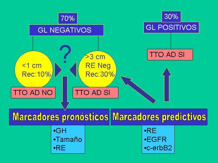 INTRODUCCIÓN El cáncer de mama constituye un serio de problema de salud en todo el mundo y en España también, ya que constituye la primera causa de muerte por cáncer femenino en nuestro país. Recientemente, la mayoría de los esfuerzos se han dirigido a su diagnóstico precoz, lo que ha dado como resultado una prolongación de la sobrevivencia, sin embargo, la mortalidad global no ha experimentado una mejoría en los últimos 20 años. Estas campañas de detección precoz, la mayor concienciación y educación pública y los métodos diagnósticos de imagen han posibilitado un diagnóstico más temprano de la enfermedad de tal forma que aproximadamente dos tercios de las enfermas no presentan afectación ganglionar en el momento del diagnóstico. MARCADORES BIOLOGICOS PRONOSTICOSY PREDICTIVOS La mayoría de estudios orientados a la búsqueda de marcadores pronósticos en el cáncer de mama se han dirigido al grupo de enfermas con ganglios linfáticos negativos en un intento de poder predecir que enfermas podrían beneficiarse de una terapia complementaria y de esta forma limitar la cirugía y terapia local para tumores de bajo riesgo. Los tratamientos quimioterápicos adicionales pueden mejorar la sobrevivencia en pacientes con carcinomas en estadios iniciales. Dado el carácter tóxico de muchos fármacos anticancerosos la selección cuidadosa de las pacientes subsidiarias de tratamiento ha de ser meticuloso. En el momento del diagnóstico el 70% de los carcinomas no presentan afectación ganglionar (Figura 1). En un grupo cada vez más amplio de casos (diagnóstico por screening), el tumor mide menos de 1 cm. La probabilidad de recurrencia en este grupo de tumores es menor del 10%. Casi todo el mundo está de acuerdo en no tratar a estas enfermas. En otro grupo de enfermas con ganglios linfáticos negativos, el tumor mide mas de 3 cm, si además son receptores de estrógenos (RE) negativos, prácticamente todo el mundo esta de acuerdo en tratar complementariamente a estas enfermas. El problema se plantea en situaciones intermedias. Es en este caso donde se necesitan marcadores pronósticos que nos faciliten el tomar la decisión de tratar a la enferma. Estos marcadores asociados con un fenotipo más agresivo se llaman marcadores pronósticos y la lista de los que se han estudiado en ensayos múltiples es muy amplia pero al día de hoy los únicos aceptados universalmente son el grado histológico (GH), tamaño tumoral y RE. El 30% restante de tumores muestra ganglios linfáticos positivos en el momento del diagnóstico y estos tumores son tratados todos con terapia adyuvante, no olvidemos que el estado ganglionar es, hasta el memento, el mejor marcador pronóstico. En el grupo de enfermas que son tratadas complementariamente, además de factores pronósticos sería de gran utilidad el conocer alguna característica fenotípica reconocida por algún marcador que estuviera asociada con una buena respuesta al tratamiento quimioterápico y/o hormonal o también al radioterapico. Se trataría de un marcador predictivo de respuesta al tratamiento. El grupo de marcadores de este tipo es también muy escaso y solo los RE, y probablemente EGFR y C-erbB-2 (HER-2/neu ) podrían incluirse en este grupo.