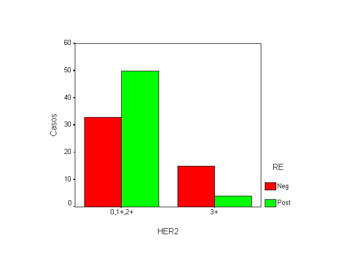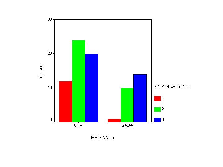 Tabla III. S-B. Scarf- Bloom Como se puede apreciar en la Tabla III el 41,2% de los CDI grado 3 eran positivos (2+ y 3+) frente al 7,7% de los casos de grado histologico 1. Esta asociación se acercó a la significación estadística (p=0.08) Observamos un mayor número de casos positivos para HER-2 en carcinomas con RE negativos. Esta asociación era altamente significativa (p=0.002) si considerábamos únicamente los casos con tinción intensa para Herceptrst (3+) y para RE (3+) (Tabla IV y Figura 10)