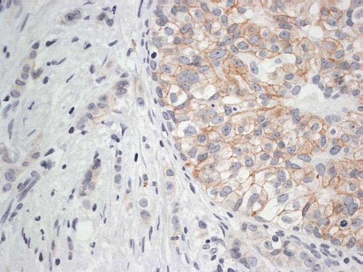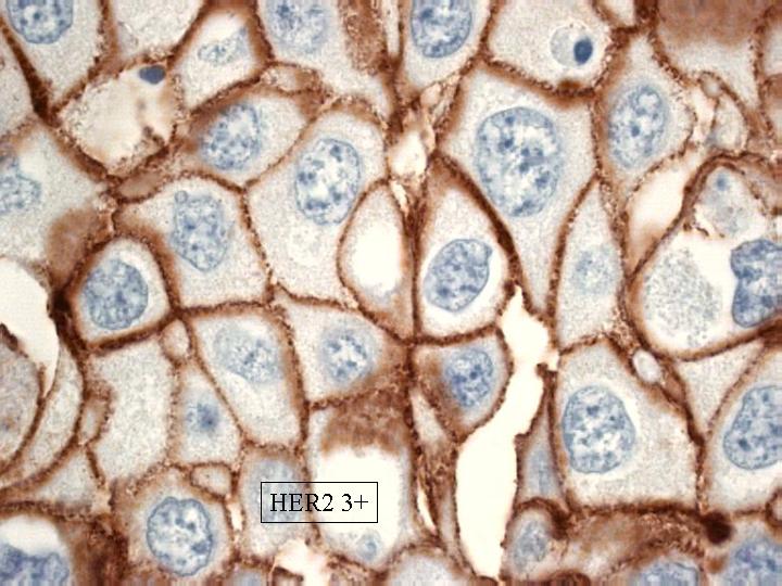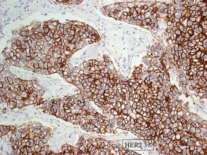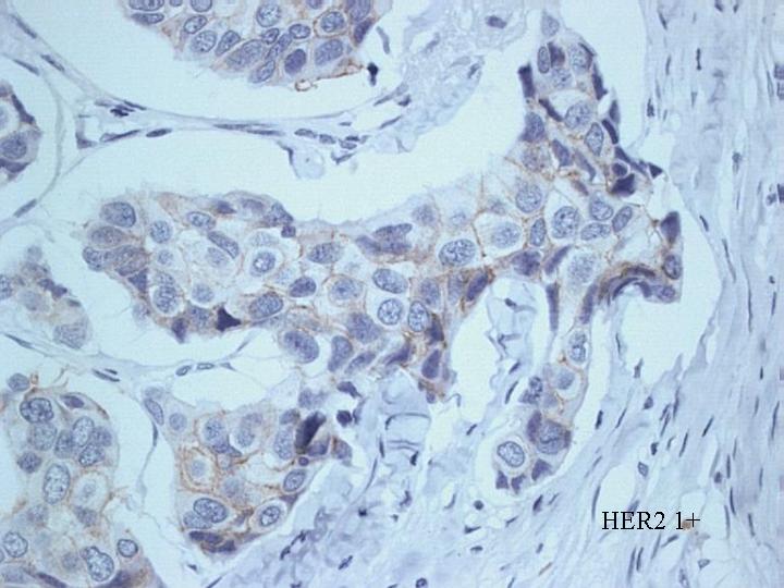 Las técnicas de FISH e inmunohistoquímicas tiene la ventaja, sobre el resto, que permiten preservar la morfologia del tumor y valorar por lo tanto la localización de la activación del gen. Las técnicas inmunohistoquímicas han utilizado diferentes anticuerpos dirigidos contra diferentes dominios de la oncoporteina. Los resultados han sido muchas veces discrepantes. Los sistemas de revelado han sido diferentes: PAP, ABC y Envisión. También los anticuerpo utilizados han sido varios: policlonales (AO485 y monoclonales (TAB250, CB11 y 4D5). Recientemente la FDA (Food and Drug Administration) de EEUU ha validado tres sistemas para la determinación del HER-2. Dos de estos sistemas utilizan técnicas de FISH y uno una técnica inmunohistoquímica (HercepTestTM) La determinación inmunohistoquímica del HER-2 (Neu) o c-erbB-2, fue realizada popr nosotros con el kit HercepTestTM (Dako). Este Test utiliza un anticuerpo policlonal (AO485) , elegido por su alta afinidad por el HER-2 en material procesado rutinariamente. La técnica se realiza en material procesado de forma rutinaria con fijación en formaldehido e inclusión del material en parafina. El protocolo se desarrolla en dos etapas: un primer paso consiste en la utilización de un anticuerpo primario de conejo frente a la proteína humana HER-2/neu, con un segundo paso en el que utiliza un anticuerpo secundario de cabra anti-conejo y peroxidasa de rábano como enzima trazadora de la reacción. Como cromógeno se utiliza la diaminobenzidina y ENVISION (Dako) como sistema de visualización. La lectura de los resultados se realiza de una forma semicuantitativa usando un microscopio óptico. La positividad se valora teniendo en cuenta el grado de intensidad y la extensión de la tinción en la membrana de las células tumorales. Los resultados se expresan de 0 a 3+. Cero y 1+ son considerados como negativos a efectos de tratamiento clínico, mientras que 2+ y 3+ son considerados como positivos. Cero significa ausencia total de tinción de membrana. 1+ se interpreta como una débil e incompleta tinción en al menos un 10% de células tumorales. 2+ se interpreta como una tinción de intensidad moderada y completa en toda la membrana en mas del 10% de células tumorales. 3+ se interpreta como un tinción intensa en toda la membrana celular en mas del 10% de la población tumoral (Figuras 5,6,7,8)