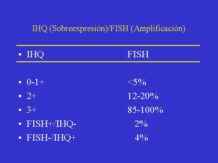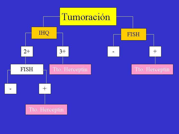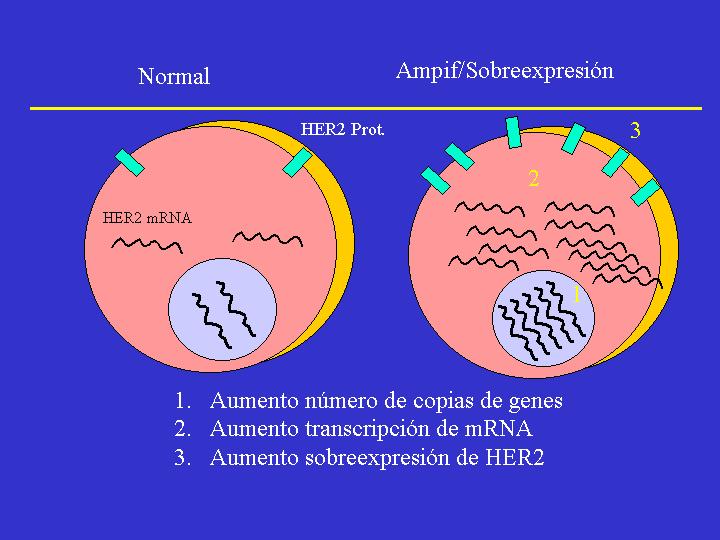 METODOLOGIA La activación de HER-2 se realiza por amplificación génica, es decir las células tumorales poseen un mayor número de copias del gen que las células normales. El mayor número en copias del gen se traduce en un aumento del RNA mensajero y en los niveles de proteína codificada por el gen. Se pueden, por lo tanto, utilizar métodos de estudio de DNA, RNA mensajero y de proteínas para valorar la activación de HER-2. Estas metodologias incluyen: