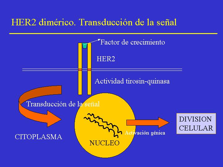 Oncoproteina c-erbB-2 (HER-2/Neu) La amplificación de algunos oncogenes o la expresión aumentada de sus oncoproteinas especialmente c-erbB-2, también llamado NEU y HER-2 (estrechamente relacionado, pero diferente al RFCE) se ha asociado con un peor pronóstico en el cáncer de mama. El gen HER-2 forma parte de una familia de genes con actividad tirosin-quinasa que codifica una proteína transmembrana. El dominio extracelular es un receptor que interacciona con un factor de crecimiento aún no identificado. La zona intracelular tiene actividad tirosin-quinasa y fosforiliza proteinas citoplasmáticas que transmiten las señales mitógenas captadas por el receptor al interior de la célula. La forma activa del gen es la dimérica, stableciendose homodímeros o bien heterodímeros con otros genes de la familia. La interacción con el ligando activa la función tirosin-quinasa del dominio intracelular. Esta activación fosforiliza una serie de proteinas citoplasmáticas y envian una señal mitógena al núcleo que propicia la divión celular y la proliferación (Figura 2) Esta secuencia de acontecimientos suceden en las células normales. En las células tumorales existe una amplificación del gen con aumento en el número de copias, aumento en la transcripción de RNA mensajero y aumento la codificación de proteinas. Por lo tanto la activación del gen HER2 se podrá valorar tanto a nivel del ADN nuclear como a nivel del RNAm y de la oncoproteína (Figura 3) La amplificación de c-erbB-2 se ha detectado en mas del 25% de carcinomas de mama en estadio I y en 40% en estadio II. La amplificación se ha observado preferentemente en tumores RE negativos. La amplificación del gen se correlaciona bien con niveles altos de la expresión de su oncoproteina ( Figura 4) Si bien muchos autores han encontrado una correlación entre la expresión aumentada de c-erbB-2 y factores pronósticos adversos tales como metástasis ganglionares, grado histológico y contenido de RE, otros grupos de investigadores han sido incapaces de encontrar ninguna correlación y muchas veces los resultados han sido controvertidos. Las diferentes metodologias utilizadas y los diferentes criterios en la selección de los pacientes explicarian muchas de las diferencias observadas en los estudios. En nuestra experiencia la positividad para c-erbB-2 se observó constantemente (100% de los casos) en carcinomas intraductales de tipo pagetoide, pero no en otros tipos de carcinoma intraductal. Observamos una mayor expresión, estadísticamente significativa, en tumores con alto índice de proliferación (Ki-67 y PCNA) y con grado histológico alto (p<0.05). En tumores con ganglio linfáticos positivos la expresión de c-erbB-2 no se correlacionó con el status ganglionar, aunque sí lo hizo con el número de ganglios linfáticos afectados (p<0.05). Unicamente encontramos una asociación significativa entre la positividad para c-erbB-2 y el periodo libre de enfermedad en el grupo de enfermas con ganglios positivos (p=0.05) La oncoproteína HER-2 es un componente normal expresado en distintos tipos de células tumorales, En el cáncer de mama, una fracción de pacientes sobreexpresan HER-2 como parte del proceso de transformación maligna. Esta sobreexpresión ha hecho de HER-2 que sea la diana a la que se han dirigida tratamientos que utilizan anticuerpos monoclonales. El HERCEPTINTM es un anticuerpo monoclonal humanizado con una gran afinidad por HER-2 y que tanto en estudios in vitro como in vivo inhibe la capacidad proliferativa de los tumores que sobreexpresan HER-2.