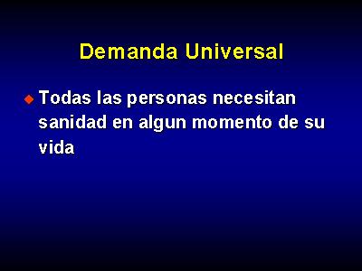 El contrario de lo que sucede en la mayoria de los bienes y servicios que adquirimos, todas las personas necesitan sanidad en algun momento de su vida. Por ello se considera que la demanda sanitaria es universal.